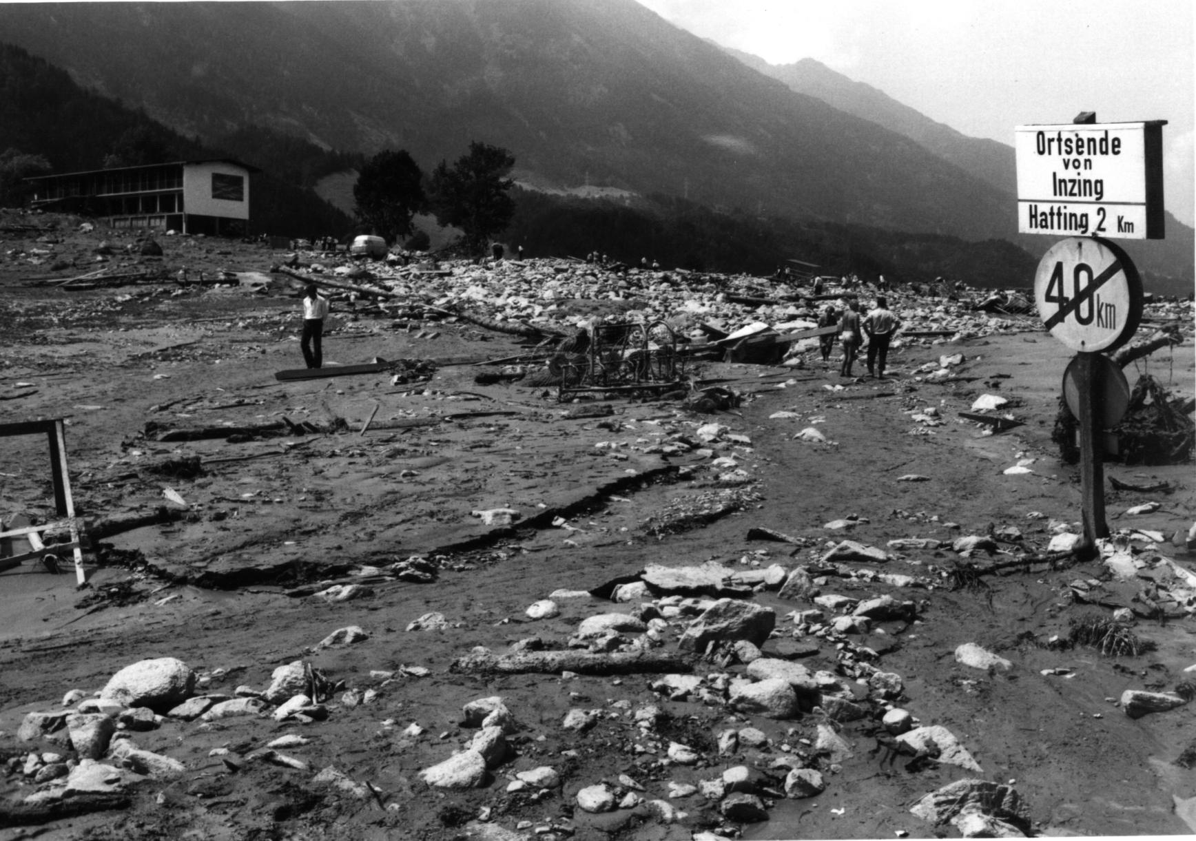 Zur gleichen Zeit wie bei uns hatten auch Flaurling und Oberhofen durch den Kanzingbach Schaden erlitten. In Oberhofen waren rund 50 ha, in Flaurling etwa 10 ha Kulturgrund überschwemmt und versandet, zwei Brücken zerstört, die Bahngeleise verlegt, das Elektrizitätswerk und die Wasserversorgungsanlage stark beschädigt.